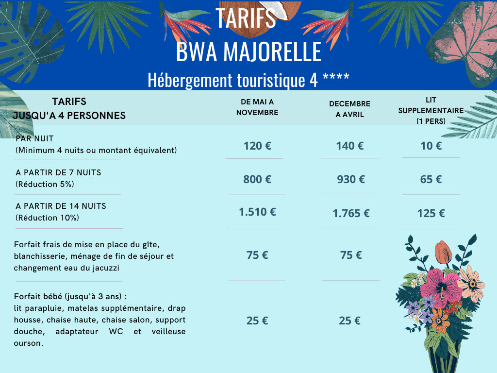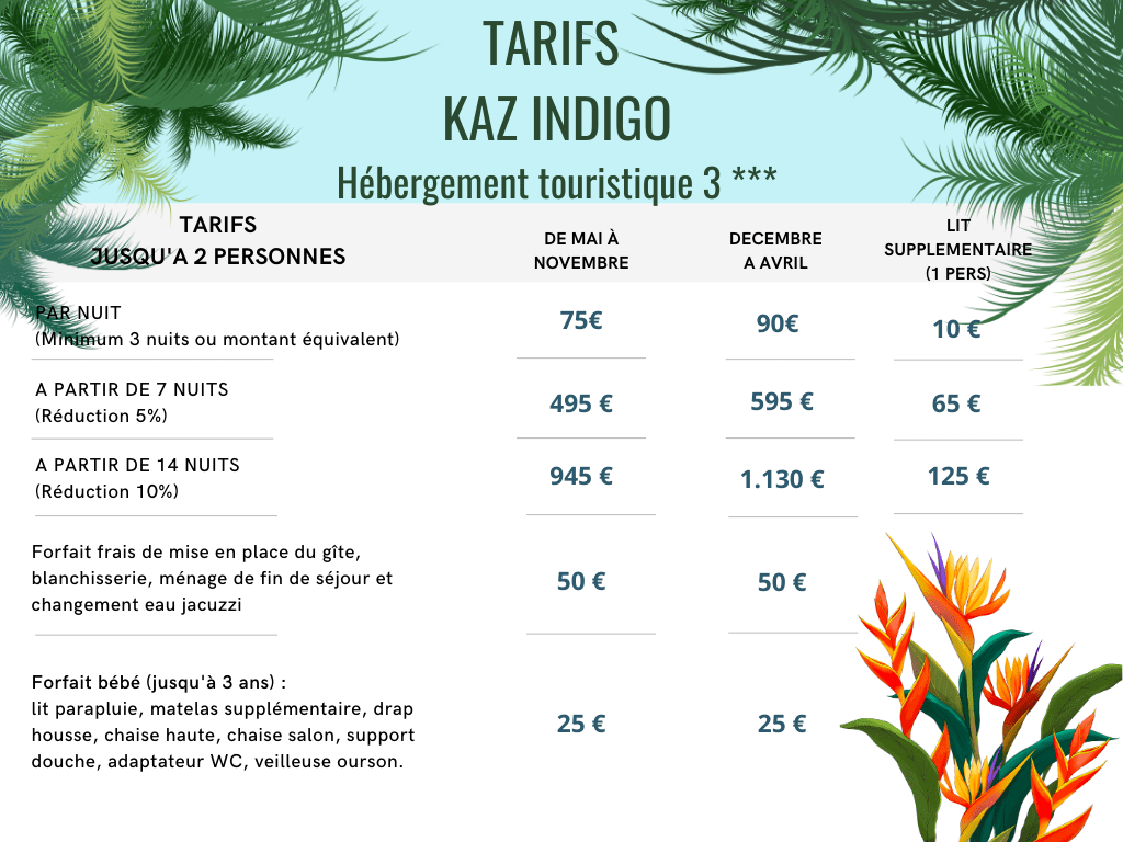 Taxe de séjour : Les tarifs sont indiqués hors taxe de séjour. Les taxes de séjour sont collectées par l’hébergeur pour le compte de l’administration. Les tarifs appliqués par la Mairie de Pointe-Noire sont les suivants: Hébergement 3* (Kaz Indigo) : 0,80€/personne/jour, Hébergement 4* (Bwa Majorelle) : 1€/personne/jour. Le montant total de la taxe de séjour est à régler impérativement en espèces le jour de l’arrivée.